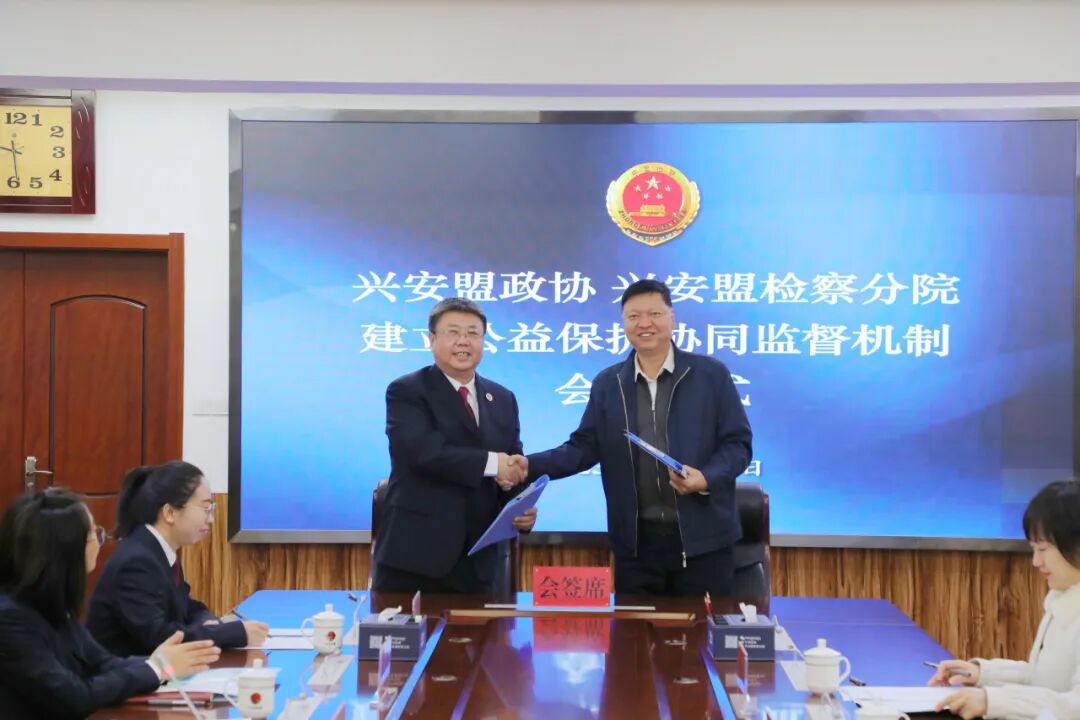 为加强人民政协民主监督与检察机关法律监督在公益保护领域的协作配合,12月21日,兴安盟政协与兴安盟检察分院联合举行《政协兴安盟委员会办公室 兴安盟检察分院关于建立公益保护协同监督机制的实施意见》会签仪式。兴安盟政协副主席王喜林,兴安盟检察分院党组书记、检察长张红霞出席会议。兴安盟政协、兴安盟检察分院相关部门负责同志参加会议。会议由兴安盟检察分院党组成员、副检察长潘勇主持。