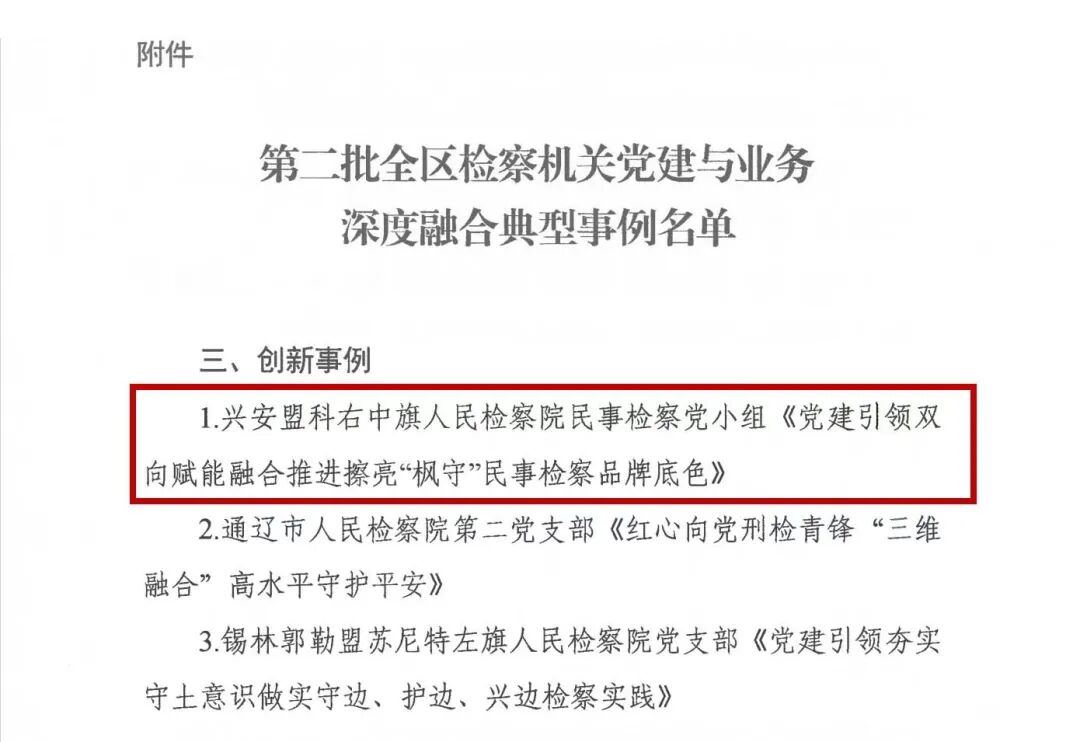 为深入学习贯彻习近平总书记关于党的建设的重要思想,全面落实党的二十届四中全会精神,深入落实最高检和自治区党委关于推动党建与业务深度融合的部署要求,持续以高质量党建引领高质效履职,自治区检察院组织开展了第二批全区检察机关党建与业务深度融合典型事例评选活动。此次评选出16个典型事例,其中科右中旗人民检察院民事检察党小组《党建引领双向赋能融合推进擦亮"枫守"民事检察品牌底色》事例成功获评“创新事例”。