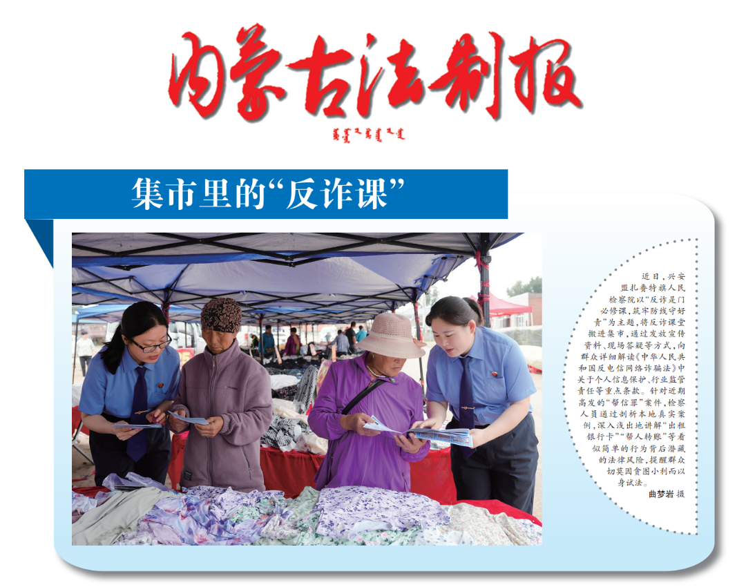 近日,兴安盟扎赉特旗检察院以“反诈是门必修课,筑牢防线守好责”为主题,将反诈课堂搬进集市,通过发放宣传资料、现场答疑等方式,向群众详细解读《中华人民共和国反电信网络诈骗法》中关于个人信息保护、行业监管责任等重点条款。