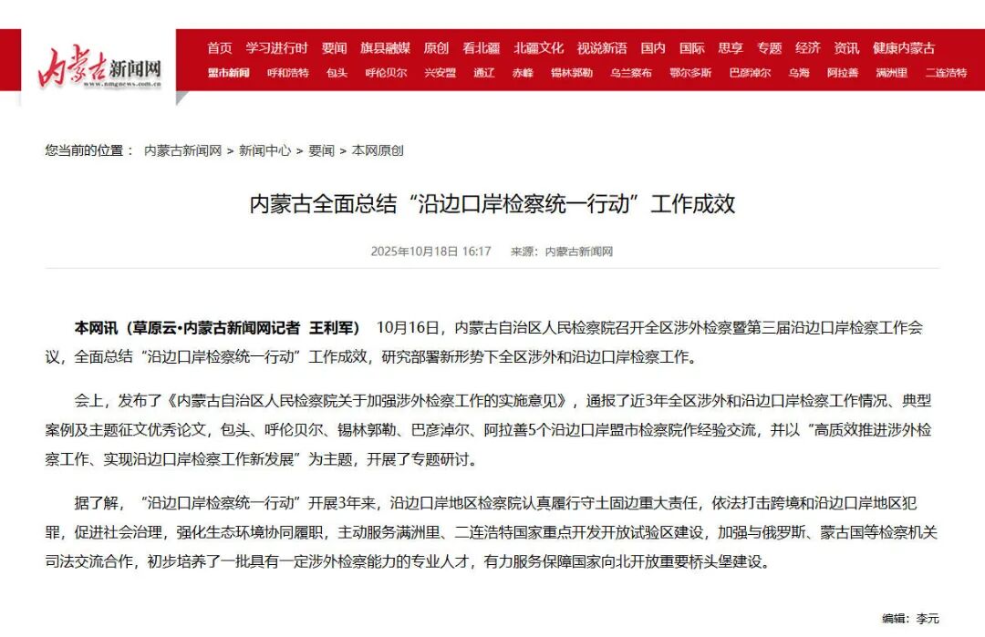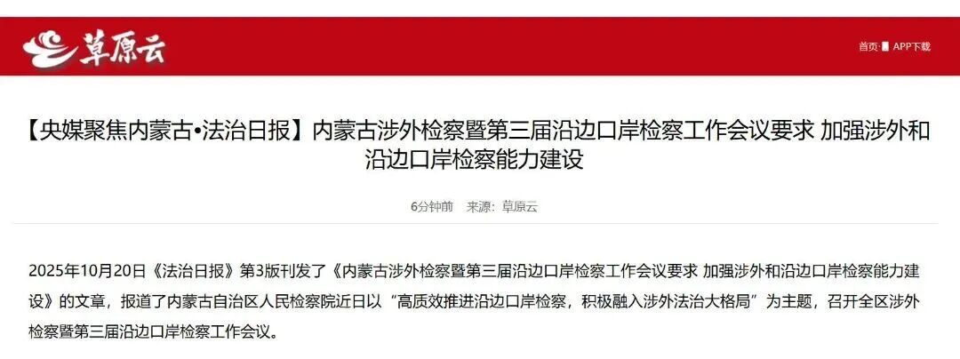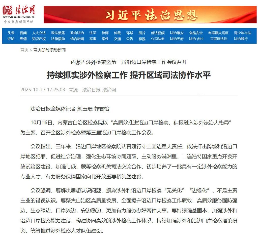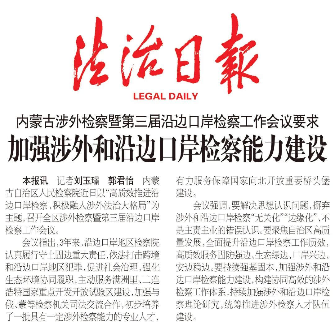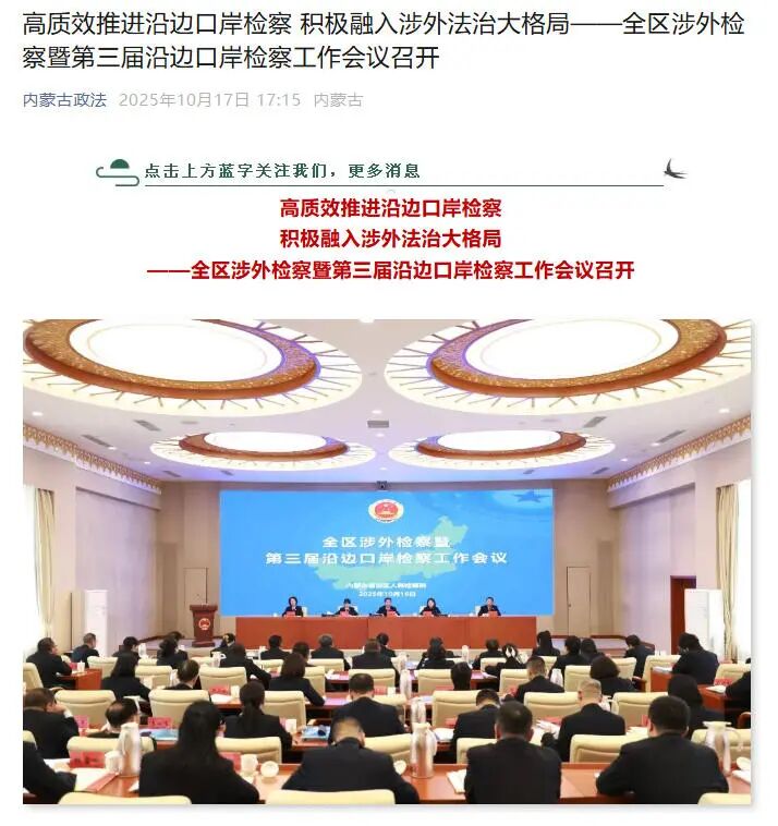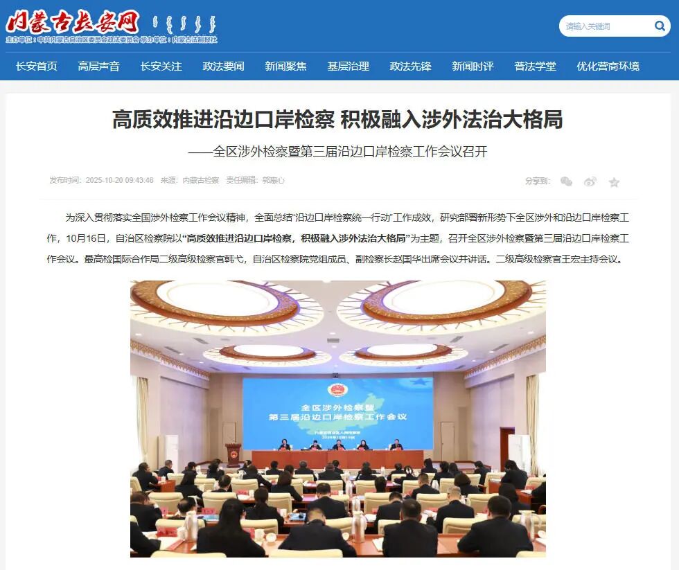 10月16日,自治区检察院召开全区涉外检察暨第三届沿边口岸检察工作会议,全面总结“沿边口岸检察统一行动”工作成效,研究部署新形势下全区涉外和沿边口岸检察工作。法治日报、内蒙古长安网、草原云等媒体相继报道。