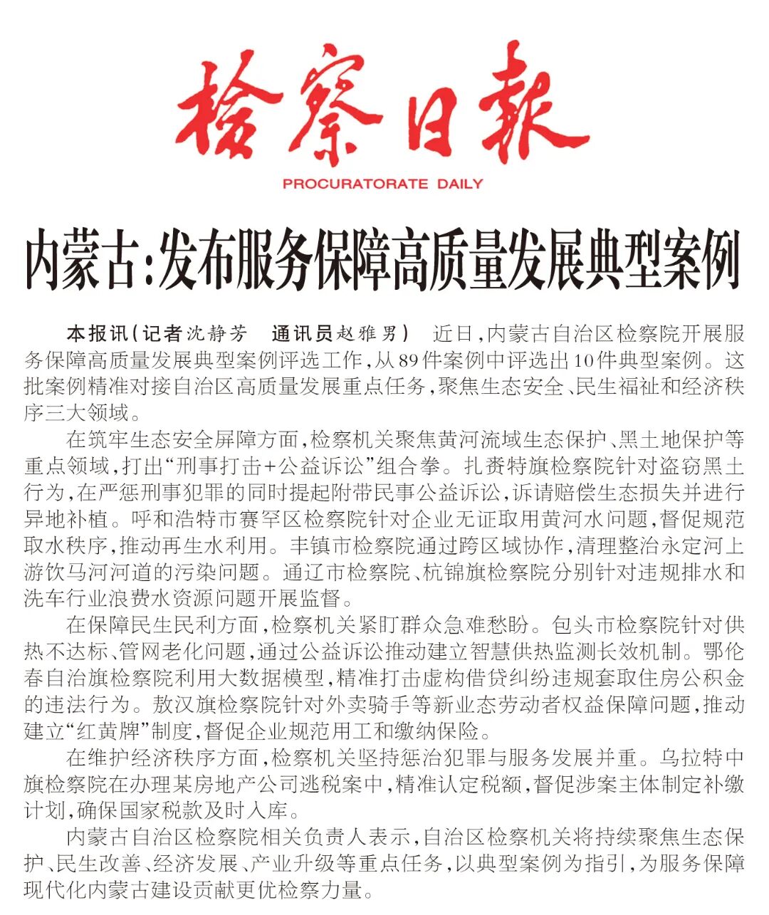 近日,内蒙古自治区检察院开展服务保障高质量发展典型案例评选工作,从89件案例中评选出10件典型案例。这批案例精准对接自治区高质量发展重点任务,聚焦生态安全、民生福祉和经济秩序三大领域。