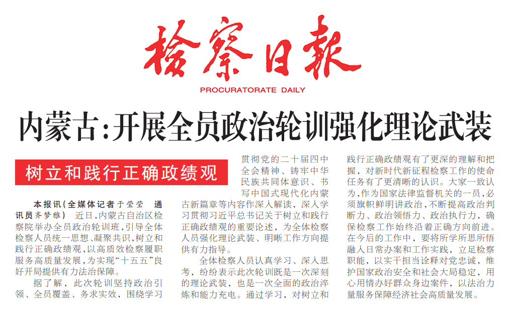 近日,内蒙古自治区检察院举办全员政治轮训班,引导全体检察人员统一思想、凝聚共识,树立和践行正确政绩观,以高质效检察履职服务高质量发展,为实现“十五五”良好开局提供有力法治保障。