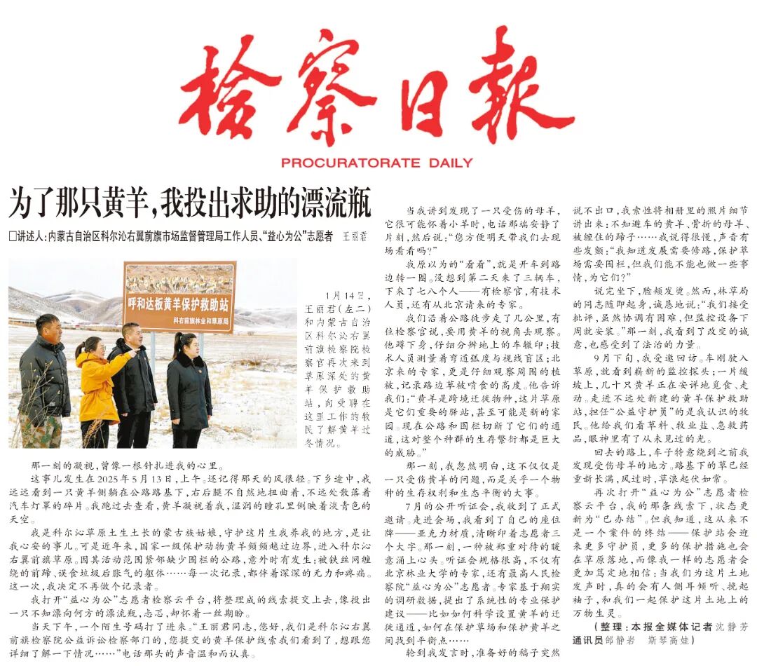当天下午,一个陌生号码打了进来。“王丽君同志,您好,我们是科尔沁右翼前旗检察院公益诉讼检察部门的,您提交的黄羊保护线索我们看到了,想跟您详细了解一下情况……”电话那头的声音温和而认真。
